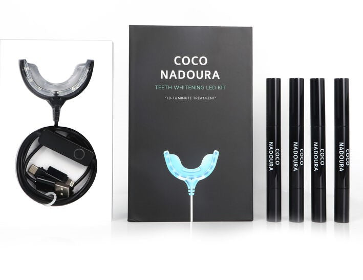 COCO NADOURA's professional teeth whitening kit 32 LEDS including 4 pens of ultra powerful gel for more whitening. The LED light helps speed up the whitening process, which can connect to most smart phones while watching your favorite movies.